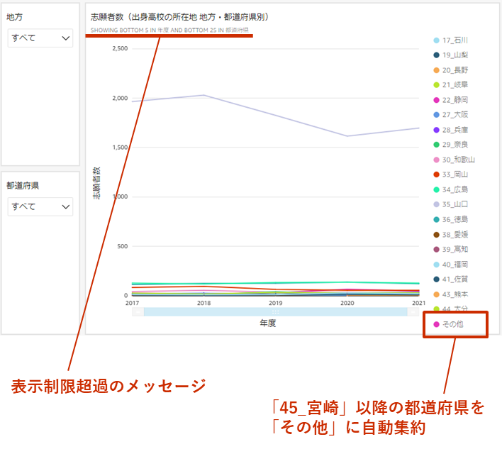 例:都道府県別の折れ線で「45_宮崎」以降が「その他」に集約された場合、地方フィルターを「8_九州」に絞ると、九州の都道府県が個別の系列で表示されます。