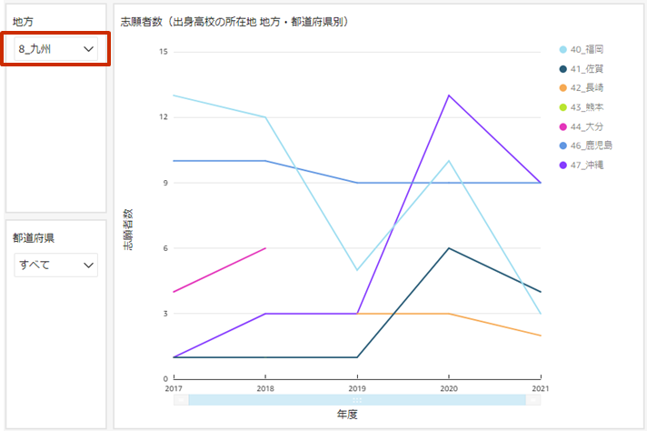 地方入学年度入試区分など)に関するフィルターをクリックして、対象範囲を絞り込みます。 - 絞り込むと、「その他」にまとめられていた系列が個別の線として表示され、内訳を確認できます。