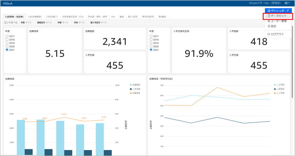 管理者でログインし、画面右上メニューからデータセットをクリックします。