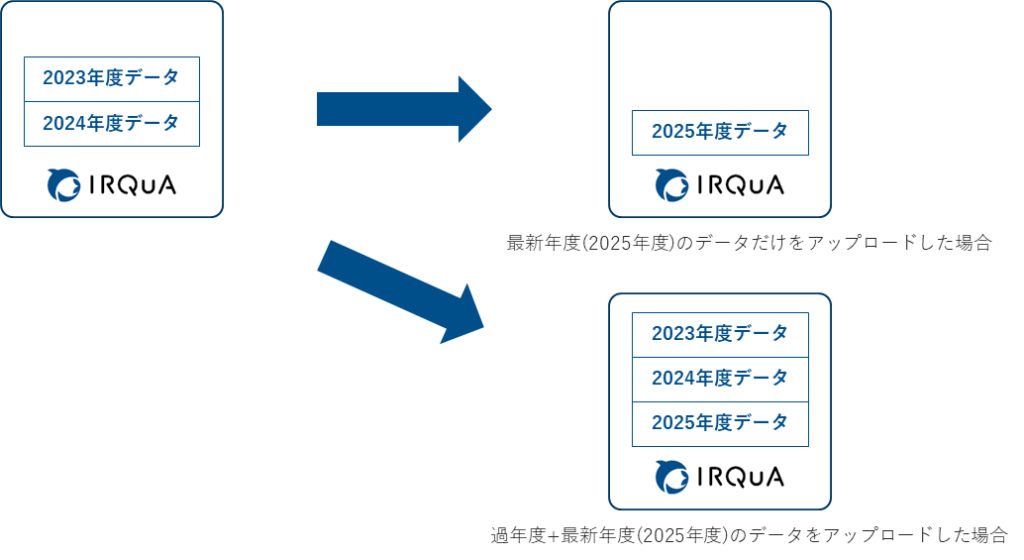 IRQuAではデータの不整合を防ぐため、アップロードするデータは「追記方式」ではなく「洗い替え方式」を採用しています。