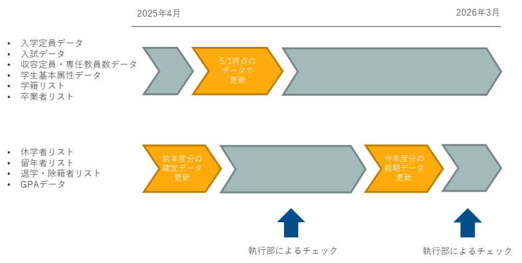 特に制約やルールはございませんので、大学様の運用に応じて任意の時点のデータをアップロードしてください。