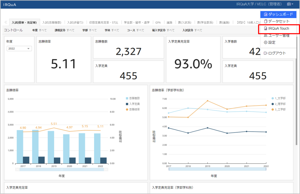 管理者アカウントでログインし、右上メニューからIRQuA Touchをクリックします。