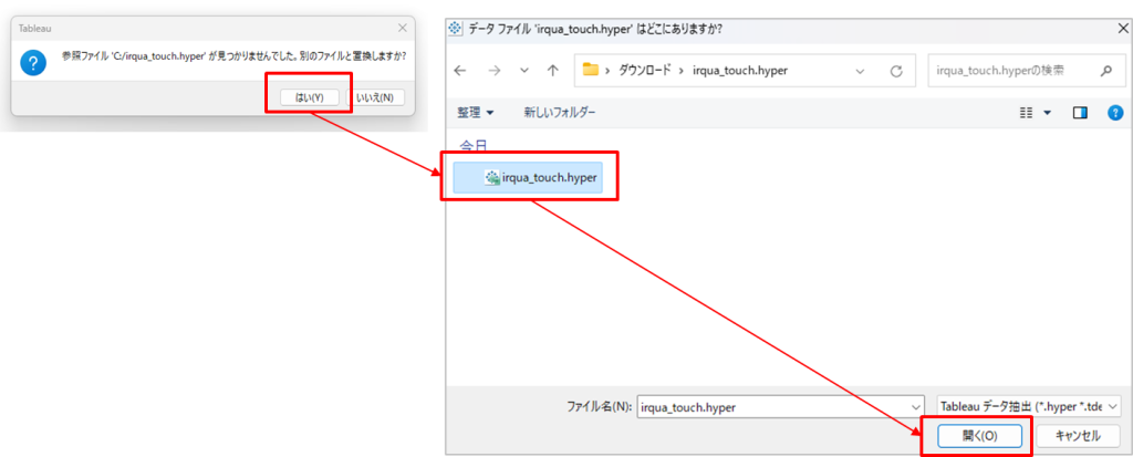 Tableau Desktopでベースワークブックを開きます。参照ファイルが見つかりませんでしたなどのメッセージが表示された場合は、展開したHyperファイルを指定して接続してください。
