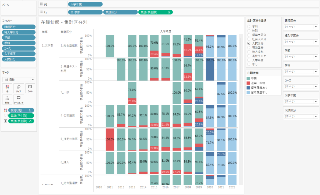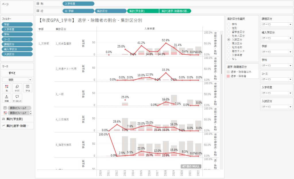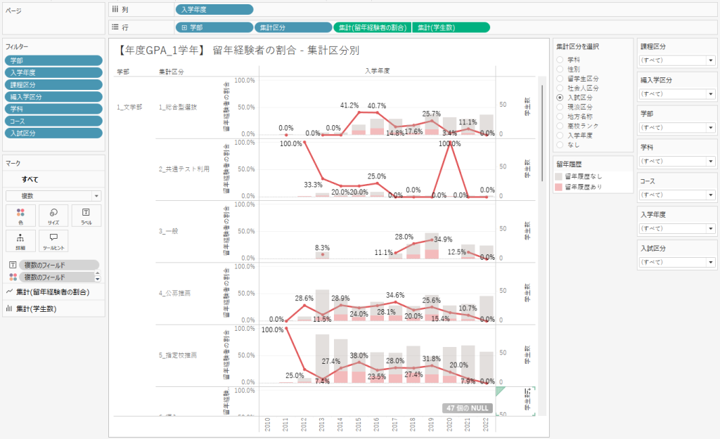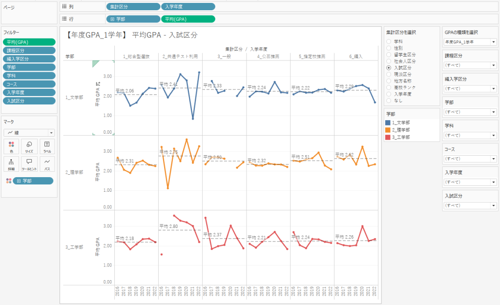今回のベースワークブックの拡張により、GPAの変化や留年、退学・除籍の傾向がより詳しくグラフにできる様になりました。
