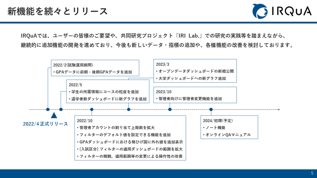 IRQuAは、ユーザー大学様からの貴重なフィードバックや、「IRI Lab.」共同研究プロジェクトの研究成果を基に、継続的に新機能を開発しリリースしてきました。