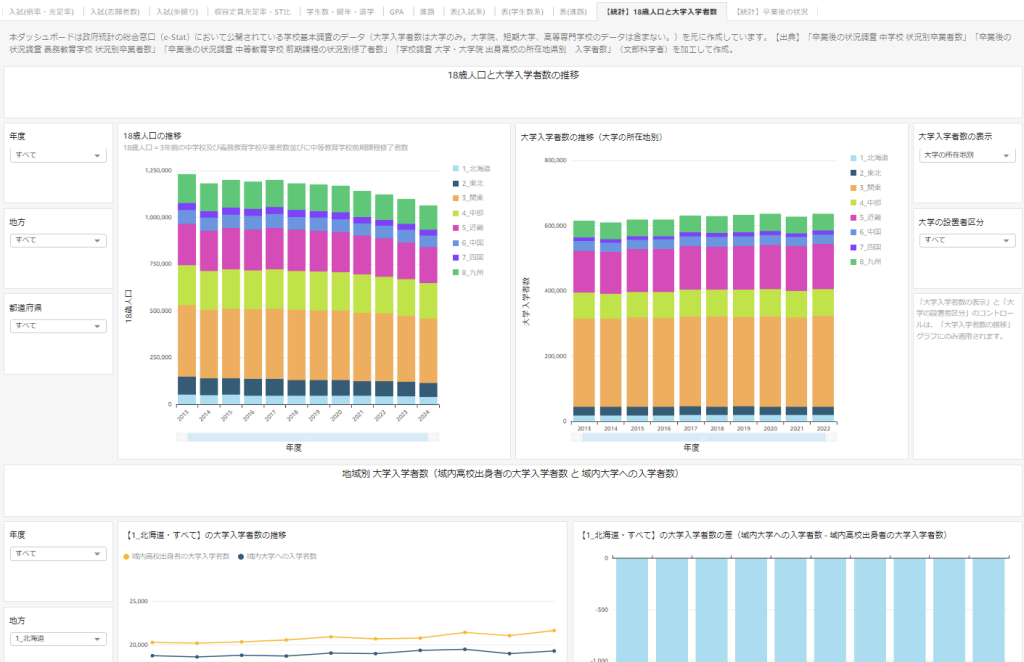 これは政府統計の総合窓口(e-Stat)において公開されている学校基本調査のデータを可視化するもので、「自大学のデータを統計データと比較したい」というユーザー大学様の声を受けて開発されました。