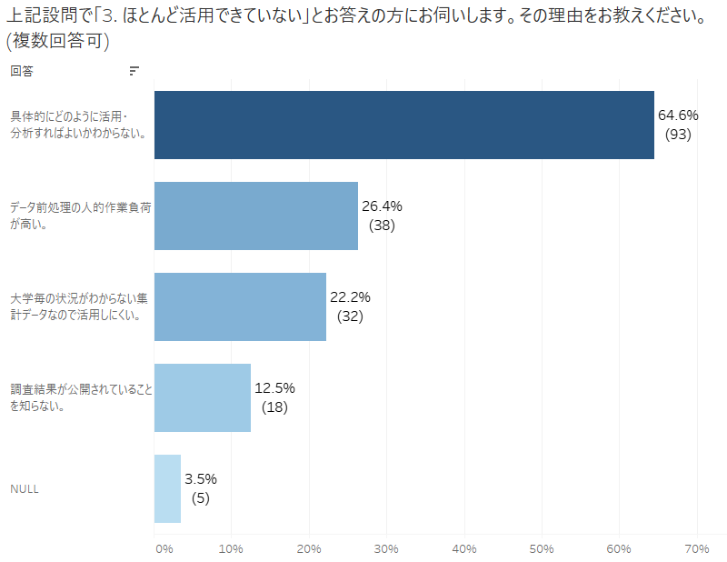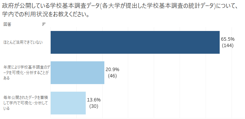 セミナー開始に先立ち事前に行ったアンケートでは65.5%の参加者が「学校基本調査データをほとんど活用できていない」と回答。そのうちの64.6%が「具体的にどのように活用・分析すればよいかわからない」という現状が明らかになりました。
