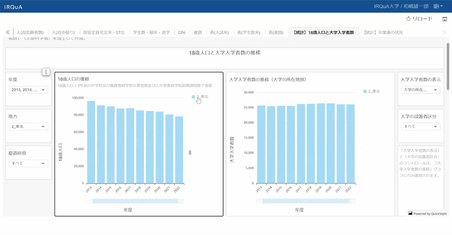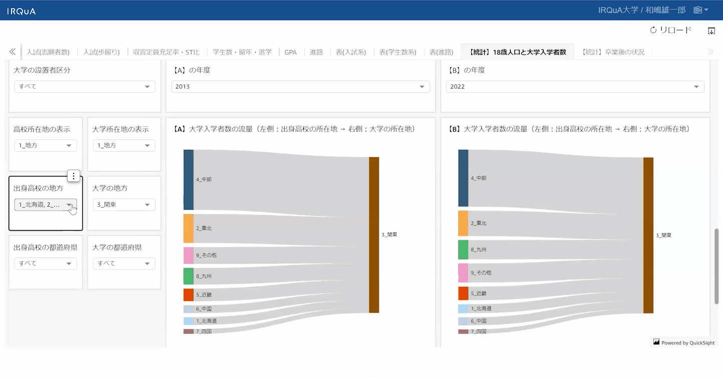 また、セミナー後半の「公開データ"利用"のコツ」では、IRQuAの学校基本調査ダッシュボードを用いて、入試広報戦略を立てるために入学者の移動状況を分析する方法をご紹介いただきました。