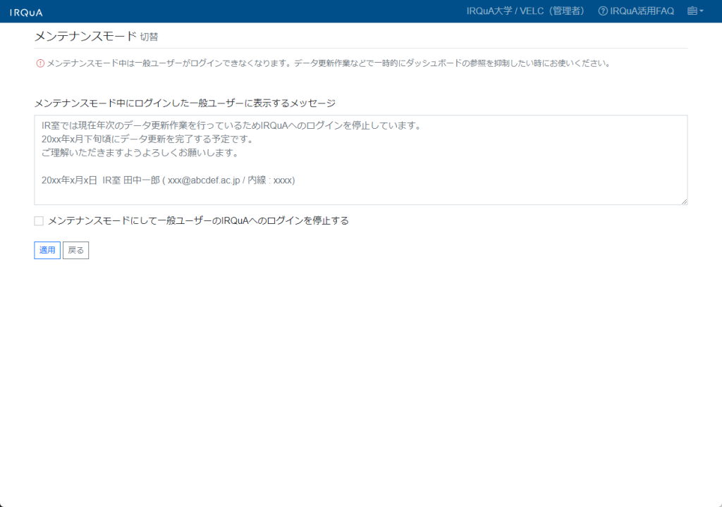 IRQuA管理者アカウントでログインし、「各種設定」→「メンテナンスモード切替」を選択してください。「メンテナンスモード中にログインした一般ユーザーに表示するメッセージ」に、メンテナンス期間や連絡先など必要な情報を記載します。次に、「メンテナンスモードにして一般ユーザーのIRQuAへのログインを停止する」にチェックを入れ、「適用」を押すとメンテナンスモードに切り替わります。