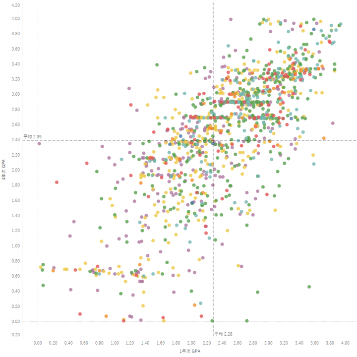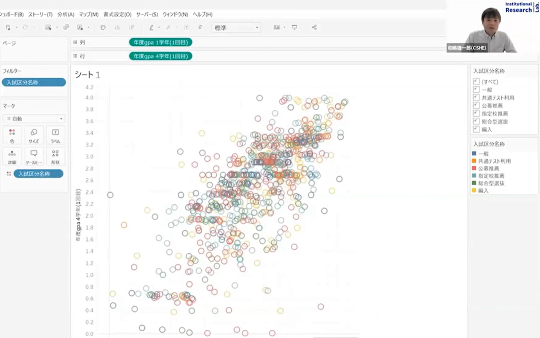 IRQuA Touchデータには、IRI Lab. 3 の知見を集約した分析用ベースワークブックが併せて提供されます。ワークブックには、大学IRの現場に即した効果的なグラフが既に用意されているため、即座に高度な分析を開始することができます。